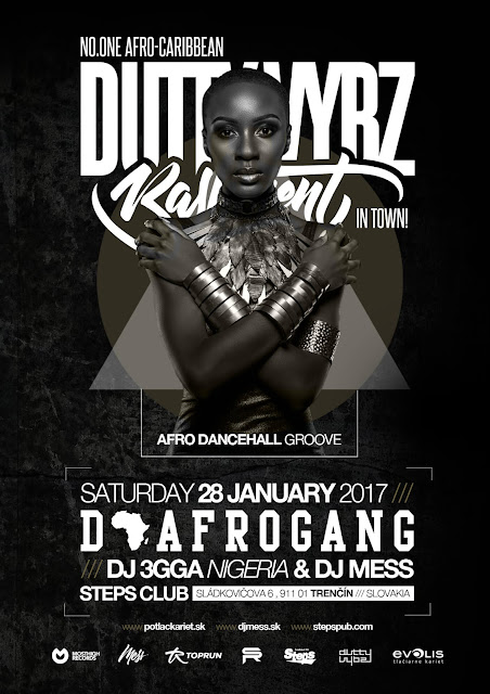 Nový Rok 2017 máme tu a s ním aj mnoho krásnych spomienok na rok minulý, v ktorom pre Vás label Most High Records v spolupráci s trenčianskym Steps Club-om priniesli niekoľko horúcich karibských parties, ktoré už dobre poznáte pod ich názvom DUTTY VYBZ (since 2011). V tomto roku pre Vás plánujeme samozrejme ďalšie pokračovania a začneme hneď 28. januára 2017 kedy zažijete noc plnú afro-karibských rytmov. Hlavný hosť večera bude nigérijský rodák žijúci vo Viedni DJ 3GGA, ktorého mnohí z Vás veľmi dobre poznajú nie len vďaka jeho DJ-ským shopnostiam, ale aj ako bravúrneho interpreta, ktorý Vás očarí hlavne jeho afrobeat-ovou selekciou. Hostiť ho bude rezidentný Dj MeSs z Ghetto Youths Sound-u, ktorý má pre Vás pripravenú zmes dancehall-u, soca či moombahtonu. Aby to bola tá pravá DUTTY VYBZ PARTY tešiť sa môžete aj na tanečné vystúpenie mladej crew, ktorá si hovorí D'AFROGANG, pričom má na svojom konte napríklad druhé miesto na World Afro Dance Championship 2016. Čo dodať? Snáď len to, že sa tešíme na Vašu účasť!